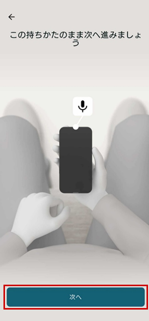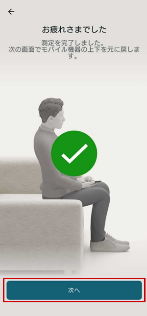 「モバイル機器を顔の高さまで持ち上げて測定します」の画面が表示されたら、画面に従いスマートフォンを顔の高さまで持ち上げ、[測定をはじめる] をタップし、完了したら [次へ] をタップします。