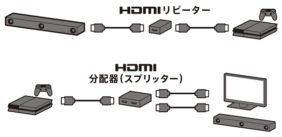 HDMIケーブル同士をつないで延長させるHDMIリピーターや、HDMI信号を分配させる分配器(スプリッター)などを使用してますか?