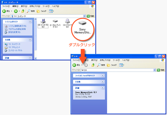 先ほど挿入した記録メディアに相当する「リムーバブルディスク」アイコンまたは「Sony MemoryStick」アイコンをダブルクリックし、ウィンドウを開きます。