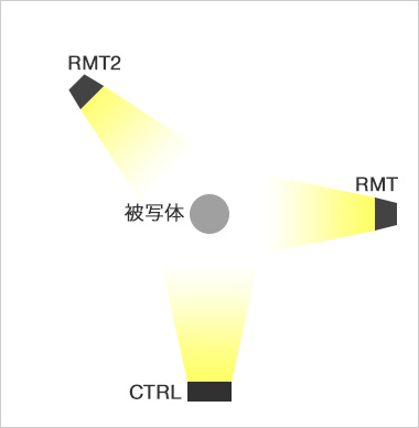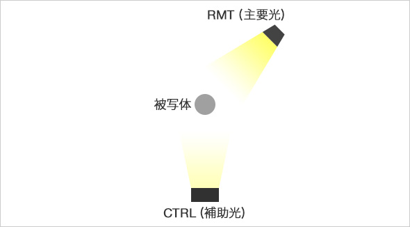 コントローラー(CTRL)とオフカメラフラッシュ(RMT/RMT2)は、パルス発光を用いた信号光で通信しています。この信号光は微弱なため、通常は薄暗い撮影環境であっても、被写体の露光量に影響を与えることはありません。