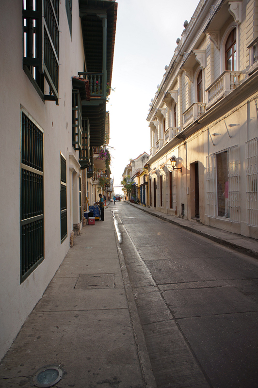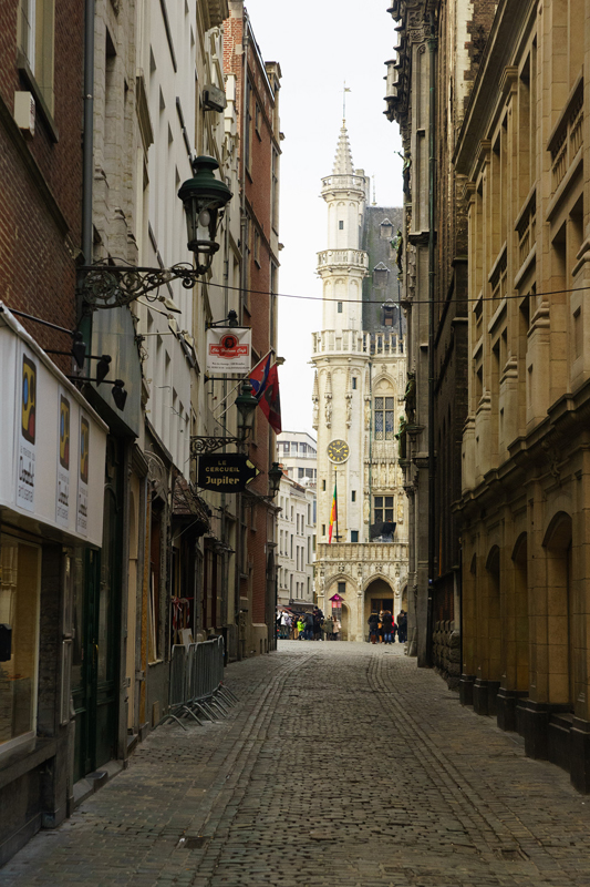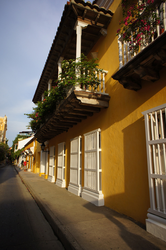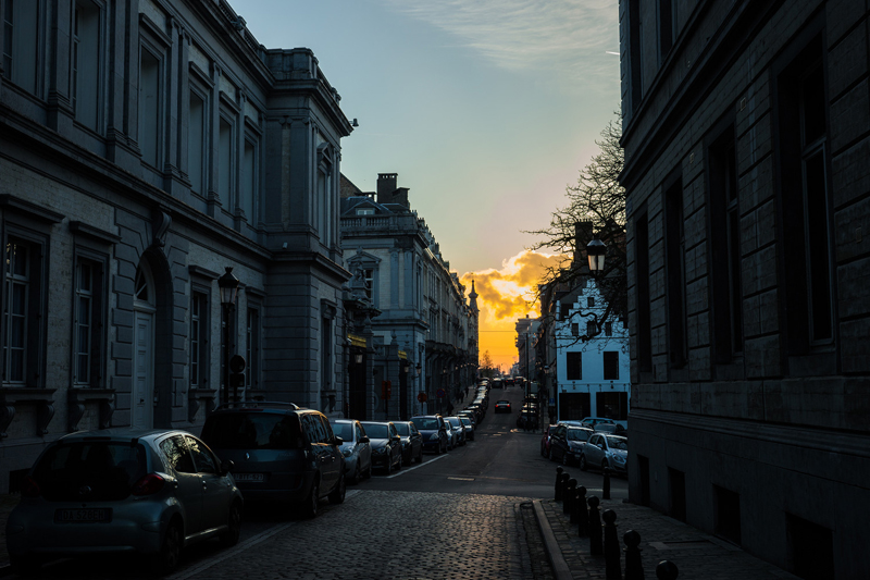 ズームレンズの50mmで撮影しました。手前から奥までピントが合いやすいように、絞りをF8で撮影しています。また、建物が斜めに写ると不安定な印象になってしまうので、カメラをしっかり垂直に構えて撮っています。望遠側で撮影することで、うまく街の特徴を切り出すことができました。広角側で撮影した時とは違い、真横の建物だけが大部分を占めてしまうこともありませんし、道路も画面の1/4くらいに収まり自然な遠近感が出ています。
