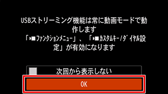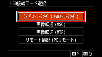 カメラの画面にUSB接続モード選択が出たら[ライブストリーミング(USBストリーミング)]を選び、OKを押す。