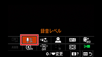 ファンクションメニューの[録音レベル]をタッチするか、[録音レベル]が選択された状態で、コントロールホイールの中央ボタンを押します。