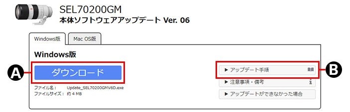WindowsまたはMacを使ってアップデートします。対応OSはアップデート手順ページ(B)を確認してください
