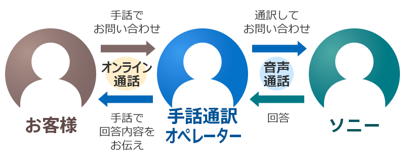 ソニーマーケティング株式会社及びソニーカスタマーサービス株式会社(以下、総称して「ソニー」といいます。)より業務委託を受けた株式会社プラスヴォイスが、お客様からのお問い合わせを手話を用いて、お客様に代わってソニーへ連絡し、通訳するサービスです。