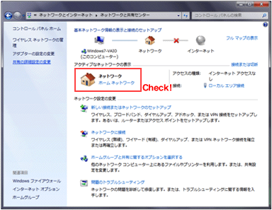 「スタート」-「コントロールパネル」を開き、「ネットワークとインターネット」の「ネットワークの状態とタスクの表示」を選択します。
