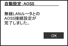 | 6. | 「無線LANルータとAOSS接続設定が完了しました。」と表示されたら [OK] を選ぶ。![]() 再接続後、手順7のサーバ選択画面が表示されます。サーバ選択画面が表示されるまで時間がかかる場合があります。 * インターネットラジオのみをお使いの場合は、以下の手順は必要ありません。 |