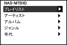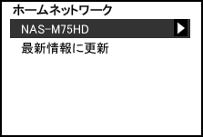 | 7. | 接続するサーバ名 ([NAS-M75HD]など) *を選ぶ。 * サーバ名は、“ネットジューク” (親機) の「サーバ設定」画面に表示される名前のことです。 ![]() ■ご注意 サーバ名が表示されない場合は、“ネットジューク” (親機) を無線LAN (アクセスポイント) に近づけて、[最新情報に更新] を選んでください。 NAS-C5と“ネットジューク” (親機) の接続が完了すると、下記の画面が表示されます。 ![]() これで“ネットジューク” (親機) との接続が完了しました。 |