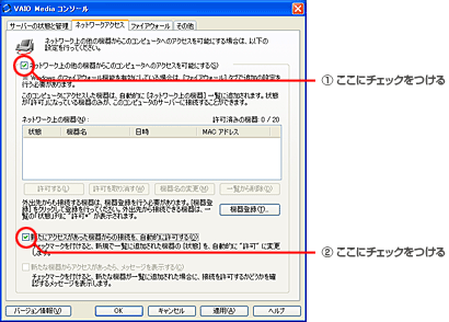 [ネットワーク上の機器からこのコンピュータへのアクセスを可能にする]にチェックをつけてから、表示される画面で[OK]をクリックし、[新たにアクセスがあった機器からの接続を、自動的に許可する]をチェックする。 |