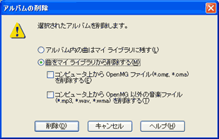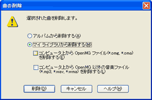 | コンピュータ上からOpenMGファイル(*.omg,*.oma)を削除する コンピュータ上で管理されているOpenMGファイル(*.omg,*.oma)は削除される。 SonicStage上に削除した曲を取り込みたい場合は、再度CDから録音およびファイルからの取り込みをおこなう。 コンピュータ上からOpenMG以外の音楽ファイル(*.mp3,*.wav,*.wma)を削除する コンピュータ上で管理されているOpenMG以外の音楽ファイル(*.mp3,*.wav,*.wma)は削除される。 削除後コンピュータ上には、OpenMGファイル(*.omg,*.oma)に変換したファイルが残り、 SonicStageから曲が確認できる。 SonicStage上に削除したファイルを取り込みたい場合は、再度ファイルをパソコンに保存する。 |