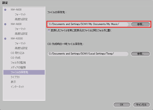音楽CDを録音するとき、または音楽ダウンロードサービスから購入したときの音楽ファイルの保存先を設定します。