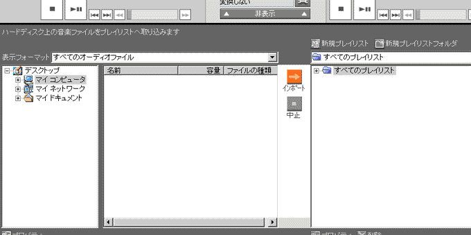 ※2取り込み先のプレイリストを選択しないで (インポート)をクリックした場合、「新しいプレイリスト(01)」(「新しいプレイリスト(02)」、「新しいプレイリスト(03)」…)という名前のプレイリストが作成され、その中に音楽ファイルが取り込まれます。