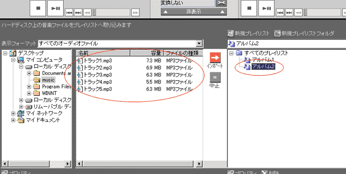 | ここではハードディスクのmusicフォルダ内にあるMP3ファイル(トラック1〜トラック5)をプレイリスト 「アルバム2」 にインポートします。