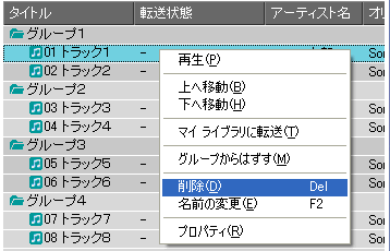 機器画面上から削除したいトラックを選択し、右クリックしてメニューを表示します。そして、「削除」を選択します。