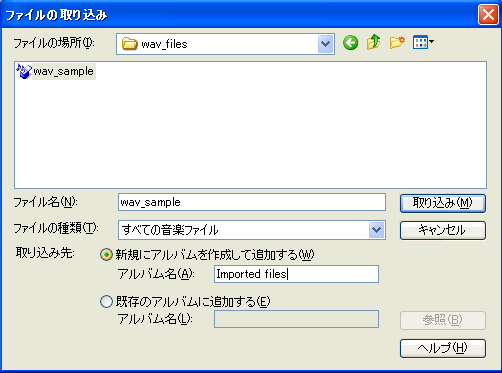 Step-3 「ファイルの場所」のドロップダウンリストから取り込みたいファイルが格納されているフォルダを選択します。 次に、取り込みたい音楽ファイルを選択します。 SonicStageに取り込み可能な音楽ファイルについては、こちらをご覧下さい。