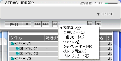 再生モード設定(全曲リピート/1曲リピート/グループ再生/グループリピート/シャッフル/シャッフル+リピート/指定なし)