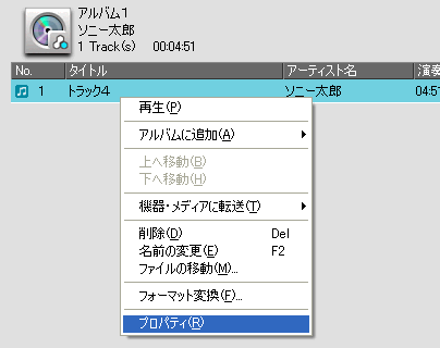 マイ ライブラリ画面上から編集したいトラック(曲)を選択し、右クリックしてメニューを表示します。そして、「プロパティ」を選択します。