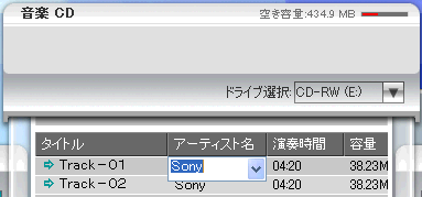 ディスクイメージ作成画面(右側の画面)からアーティスト名を変更したい曲のアーティスト名が表示されている場所を選択し、もう1度同じ場所をクリックします。