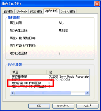 Step-2 曲のプロパティ画面で「権利情報」タブをクリックします。 ここで、下図のように「残り音楽CD作成回数」の項目が「0(ゼロ)」になっている曲を用いて音楽CDを作成することはできません。