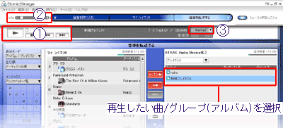 機器・メディアパネルの曲/グループ(アルバム)を選択してを押す グループ(アルバム)を選択した場合は、グループ(アルバム)の1曲目から再生する。