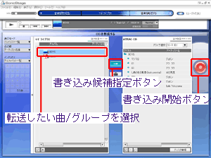 転送したい曲/グループを[マイ ライブラリ]から選択して書き込み候補指定ボタンを押して[ATRAC CD]の曲一覧に追加し、書き込み開始ボタンを押す ※画像はSonicStage Ver.3.4の場合