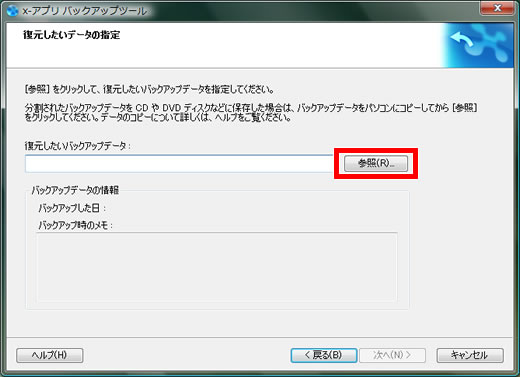 - バックアップしたデータを復元するパソコンは、バックアップデータ作成時と同じバージョンのx-アプリ、もしくは、バックアップデータ作成時よりも新しいバージョンのx-アプリがインストールされている必要があります。