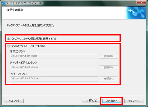 「 指定したフォルダーに復元する 」を選択した場合は、バックアップした各コンテンツ別に [参照] をクリックして復元先のフォルダを指定し、「 次へ 」ボタンをクリックします。