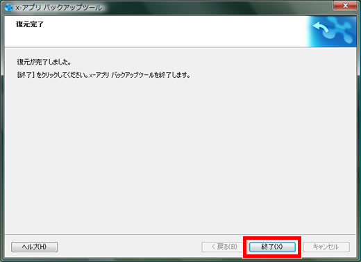 「 x-アプリ 」データの復元が完了すると「 復元完了 」画面が表示されます。