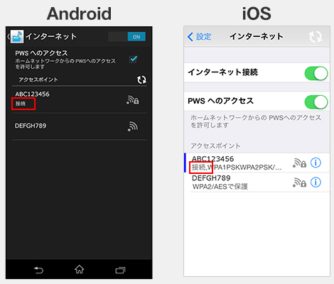 無線LANの接続先一覧で、接続した無線LANルーターのSSIDの下に「接続」と表示されていれば、接続が成功しています。