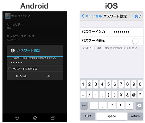 ④ 8〜63文字のお好きな英数字のパスワードを入力し、「OK」または「完了」をタップしてください。