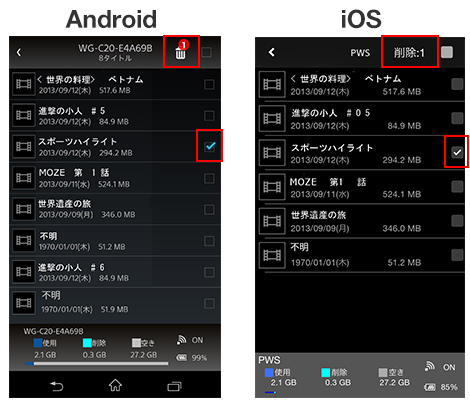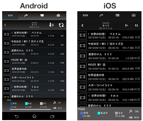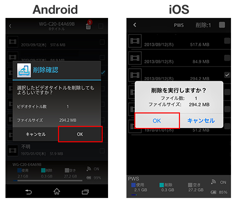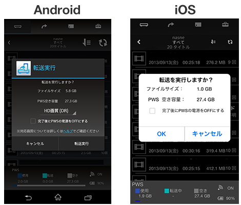 ② ビデオタイトルの「ファイルサイズ」と「PWS空き容量」が表示されるので、確認後、「転送実行」または「OK」をタップしてください。