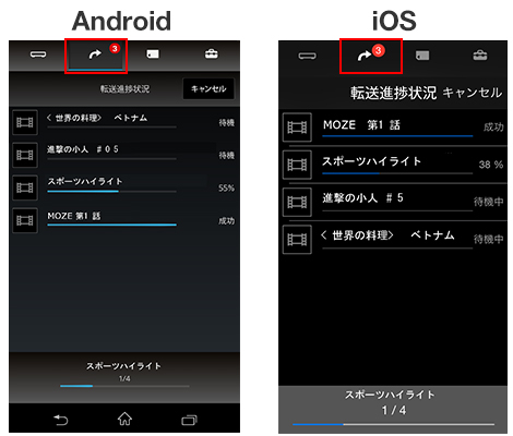 選んだビデオタイトルの行にプログレッシブバーが表示され、転送状況を確認できます。