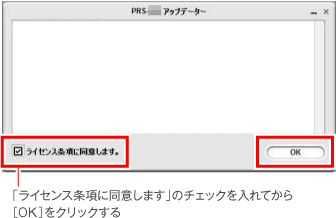 「ライセンス条項」のウィンドウが現われたら、条項をお読みになった上で「ライセンス条項に同意します」のチェックを入れ、[OK]をクリックしてください。