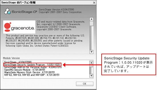SonicStage Security Update Program 1.0.00.11020が表示されていれば、正常にアップデートは完了しています。