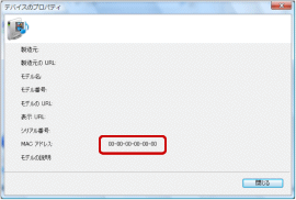 [MACアドレス]の情報を確認し、お持ちのDPF-WA700/W700のMACアドレスと同じであることを確認します。右下の[閉じる]をクリックして、[デバイスのプロパティ]ダイアログボックスを閉じます。