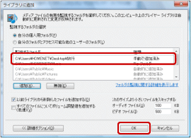 メディアの種類で、[画像(P)]チェックボックスがオンに、[音楽(M)]チェックボックスがオンにしなっていることを確認し、右下の[OK]をクリックします。(オンになっていなかったら、チェックボックスをオンにしてください。)