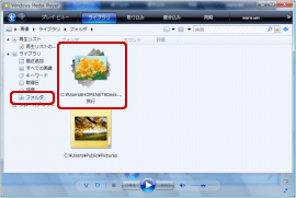 なお、Windows Media Playerをはじめて起動すると、パソコン上の特定の既定フォルダ(たとえば、マイピクチャなどのフォルダ)が自動的に検索、監視され、画像(静止画)や音楽が、ライブラリに追加されるような設定になっています。この特定の既定フォルダ内にある画像(静止画)や音楽は、次の操作を行わなくても、DPF-WA700/W700で再生することができます。