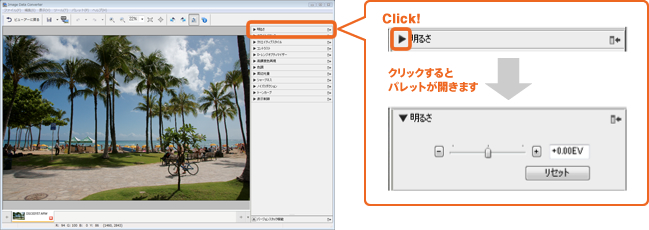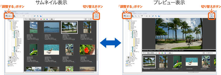 ビューアーモードでサムネイルをダブルクリックするか、ツールバーの「調整する」ボタンをクリックすると、調整モードを開くことができます。