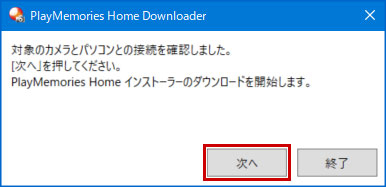 「対象のカメラとパソコンとの接続を確認しました。」と表示されたら[次へ]を押してください。PlayMemories Home インストーラのダウンロードを開始します。