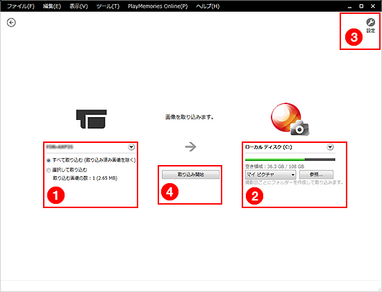 取り込み画面が表示されます。初期設定ではマイピクチャに撮影日ごとにフォルダーを作成して取り込む設定になっています。