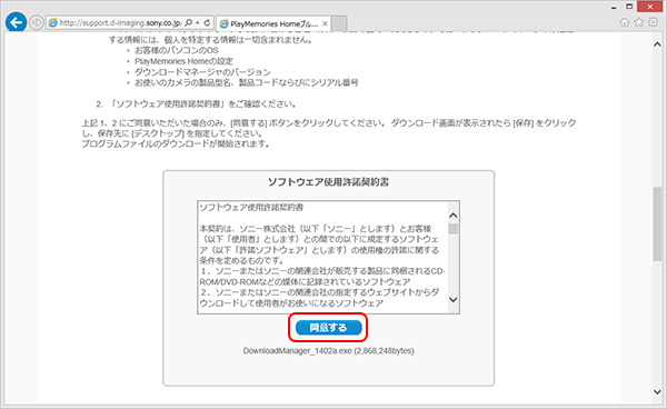 • 「ソフトウェア使用許諾契約書」をご確認いただき、記載内容にご同意いただいた場合のみ、[同意する] ボタンをクリックします。