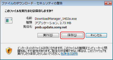 ダウンロード画面が表示されたら [保存] をクリックし、保存先に [デスクトップ] を表示されたページの[PlayMemories Homeをインストールする]をクリックしてファイルをダウンロードします。