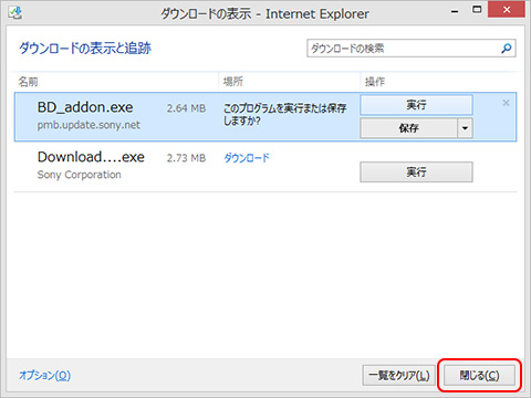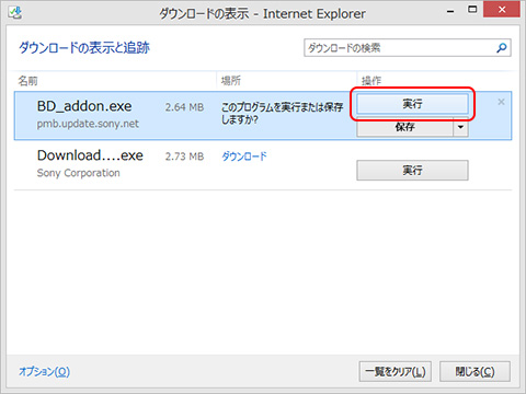 • 「ダウンロードの表示」画面が表示されたら、[BD_addon.exe]を選択した状態で、[実行]を選択します。