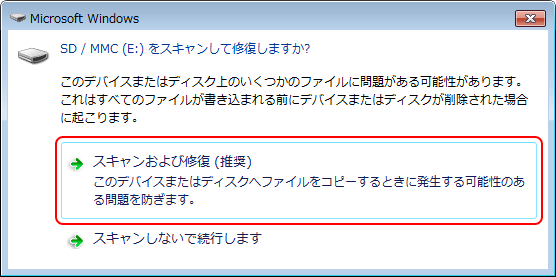 以下のメッセージが表示された場合は、メモリーカードに問題が発生している場合があります。[スキャンおよび修復]を選択すると、修復をおこないます。[続行]を選択すると、そのままPlayMemories Homeを起動します。