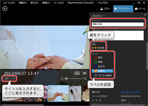 プロパティーをクリックするか、PlayMemories Homeのメニューから [編集] - [評価・ラベル・説明の編集] をクリックします。