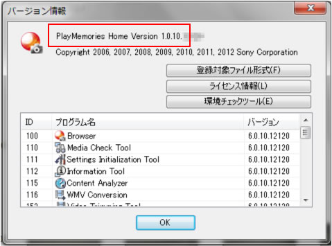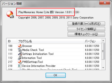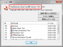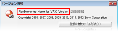- バージョン情報に、「“PlayMemories Home”(Lite版)または“PlayMemories Home”」と「バージョン」が表示されます。