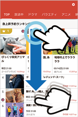 をタップし、番組コンテンツエリアの任意の位置で、プルトゥリフレッシュ(指を画面に接したまま下に数センチスワイプしたのち指を離す操作)をします。すると、矢印がグルグル回るアイコンが一瞬表示され、アプリが更新されます。
