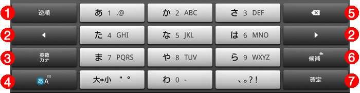 例えば、「な」を入力した後に「逆順」キーを1回タップすると、「の」に変更されます。もう一度タップすると「ね」に変更されます(「な→の→ね→ぬ→に」という順)。