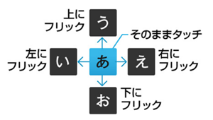 「あ」キーの上下左右方向には、あ行のほかの文字(い、う、え、お)が割り当てられていて、「い」を入力したいときは左へ、「う」なら上へ、「え」なら右へ、「お」であれば下へ指をフリックしてそれぞれの文字を入力します。