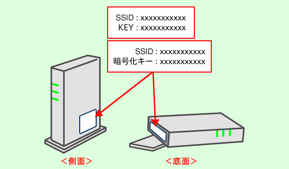 - お使いの無線LAN機器によっては、パスワードは「暗号化キー」ではなく、「KEY」、「セキュリティキー」などと記載されている場合もあります。